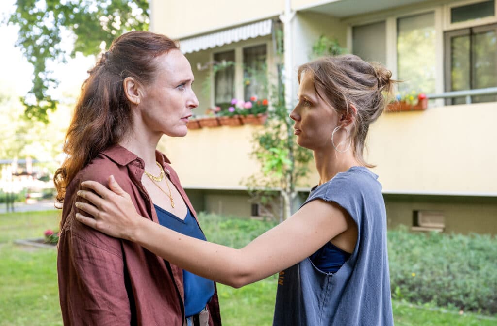 ARD/rbb POLIZEIRUF 110: GOLDRAUB, Fernsehfilm Deutschland 2026, am Sonntag (29.03.26) um 20:15 Uhr im ERSTEN. Romy Berger (Meira Durand, re.) tröstet die Mutter ihres ehemaligen Lebensgefährten, Bettina Michalski (Deborah Kaufmann, li.), deren Mann bei einem Raubüberfall auf ihr Juweliergeschäft erschossen wurde. © rbb/Christoph Assmann, honorarfrei - Verwendung gemäß der AGB im engen inhaltlichen, redaktionellen Zusammenhang mit genannter rbb-Sendung bei Nennung "Bild: rbb/Christoph Assmann" (S2+). rbb Presse & Information, Masurenallee 8-14, 14057 Berlin, Tel: 030/97 99 3-12118 oder -12116, pressefoto@rbb-online.de
