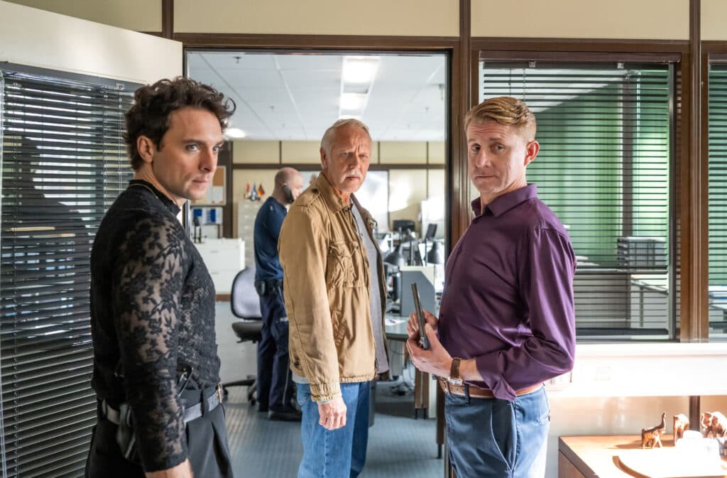 ARD/rbb POLIZEIRUF 110: GOLDRAUB, Fernsehfilm Deutschland 2026, am Sonntag (29.03.26) um 20:15 Uhr im ERSTEN. Die Kriminalkommissare Vincent Ross (André Kaczmarczyk, li.), Karl Rogov (Frank Leo Schröder) und Wiktor Krol (Klaudiusz Kaufmann, re.) vom Deutsch-Polnischen Kommissariat in Swiecko ermitteln im Fall einer Raubserie auf Juweliergeschäfte in der Grenzregion. © rbb/Christoph Assmann, honorarfrei - Verwendung gemäß der AGB im engen inhaltlichen, redaktionellen Zusammenhang mit genannter rbb-Sendung bei Nennung "Bild: rbb/Christoph Assmann" (S2+). rbb Presse & Information, Masurenallee 8-14, 14057 Berlin, Tel: 030/97 99 3-12118 oder -12116, pressefoto@rbb-online.de