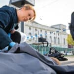 »Underneath the bridge, tarp has sprung a leak /