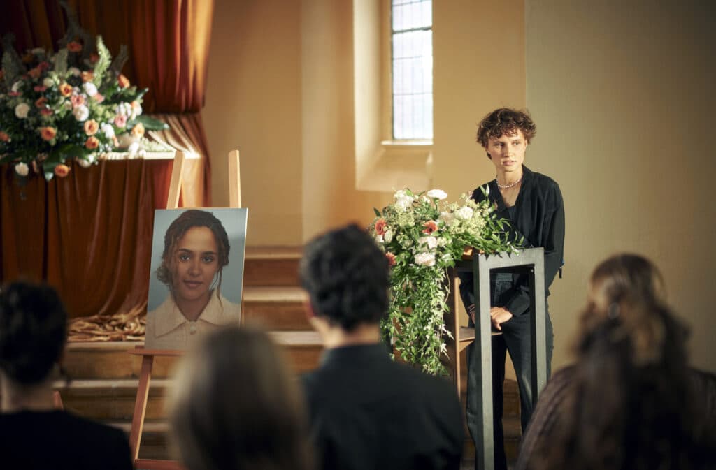 ARD/MDR POLIZEIRUF 110: YOUR BODY MY CHOICE, am Sonntag (08.03.26) um 20:20 Uhr im ERSTEN. Lara Becker (Luna Jordan) redet auf der Beerdigung von Marwa (Melissa Gross) © MDR/Felix Abraham, honorarfrei - Verwendung gemäß der AGB im engen inhaltlichen, redaktionellen Zusammenhang mit genannter MDR-Sendung bei Nennung "Bild: MDR/Felix Abraham" (S2+). MDR/HA Kommunikation, 04360 Leipzig, Tel: (0341) 300 6477 oder - 6463