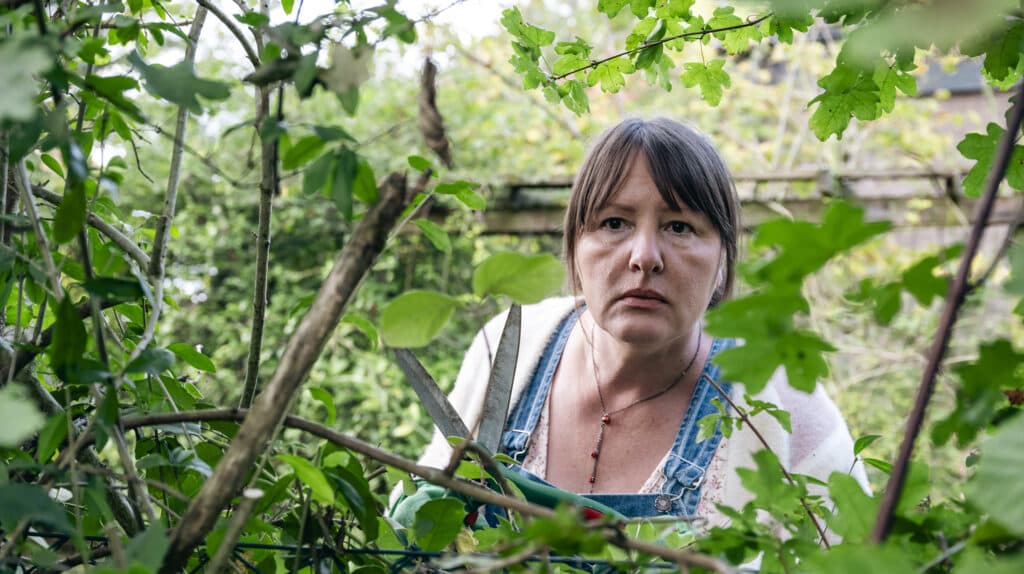 Eva Beck-Haberer (Nina Vorbrodt) beobachtet den Polizei- und Feuerwehreinsatz im Nachbarhaus.