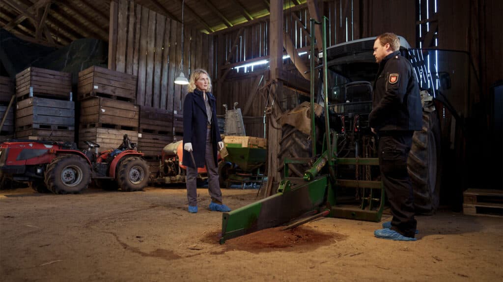 Charlotte Lindholm (Maria Furtwängler) und Olaf Gehrke (Ole Fischer) untersuchen den Heuballenschneider, durch den Hofmitarbeiter Victor ums Leben gekommen ist.
