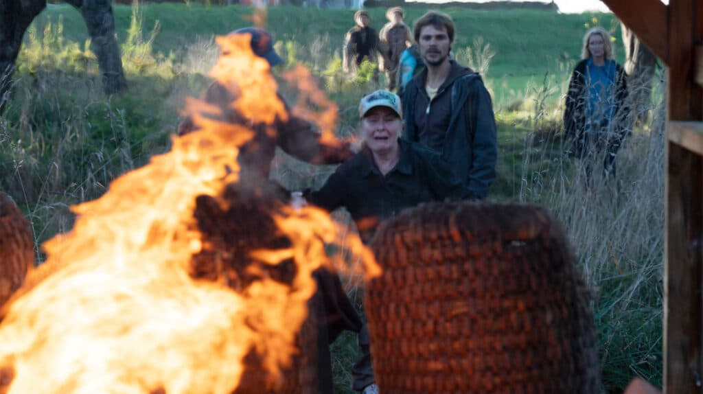 Ihre geliebten Bienen fallen einem Brand zum Opfer: Marlies Feldhusen (Lina Wendel, 2.v.l) ist verzweifelt (mit Henning Flüsloh 2.v.r. und Maria Furtwängler, r.).