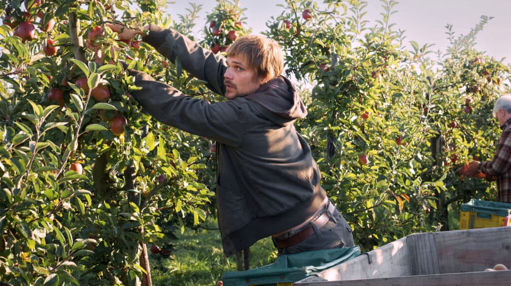 Die Familie packt an: Sven Feldhusen (Henning Flüsloh) bei der Bio-Apfelernte.