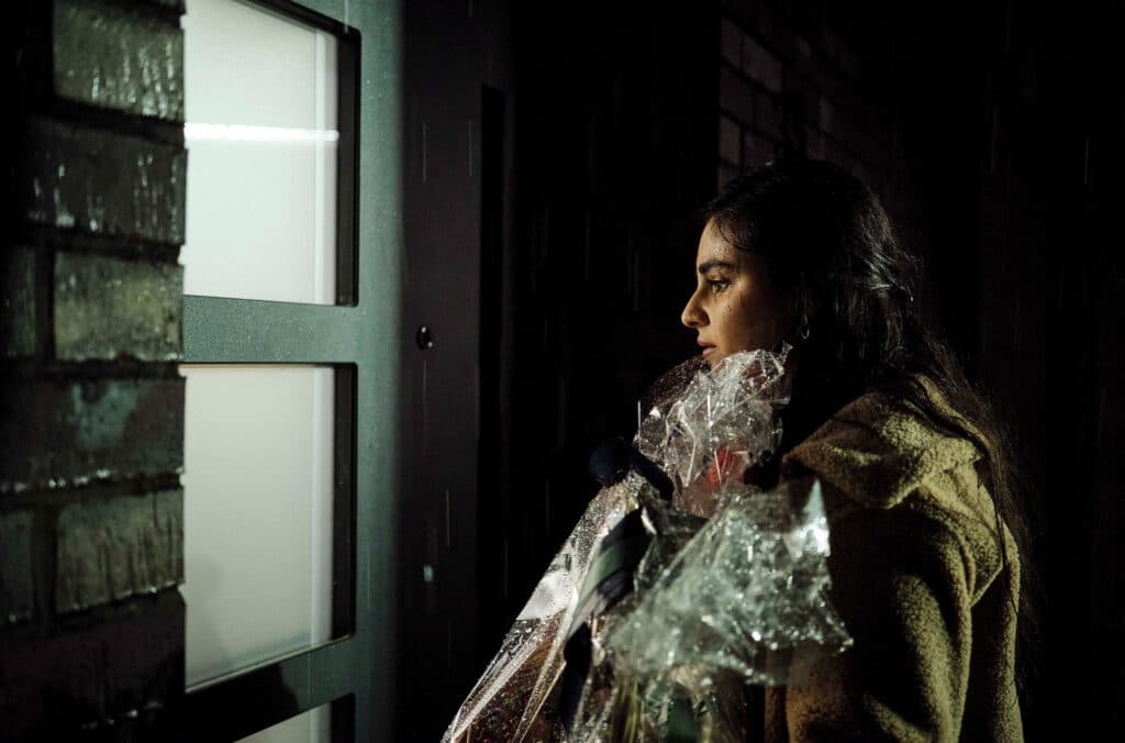 Nelly (Bayan Layla) sieht und hört ihre Freunde in der Wohnung. Aber die beiden wollen sie offensichtlich nicht sehen und öffnen nicht.