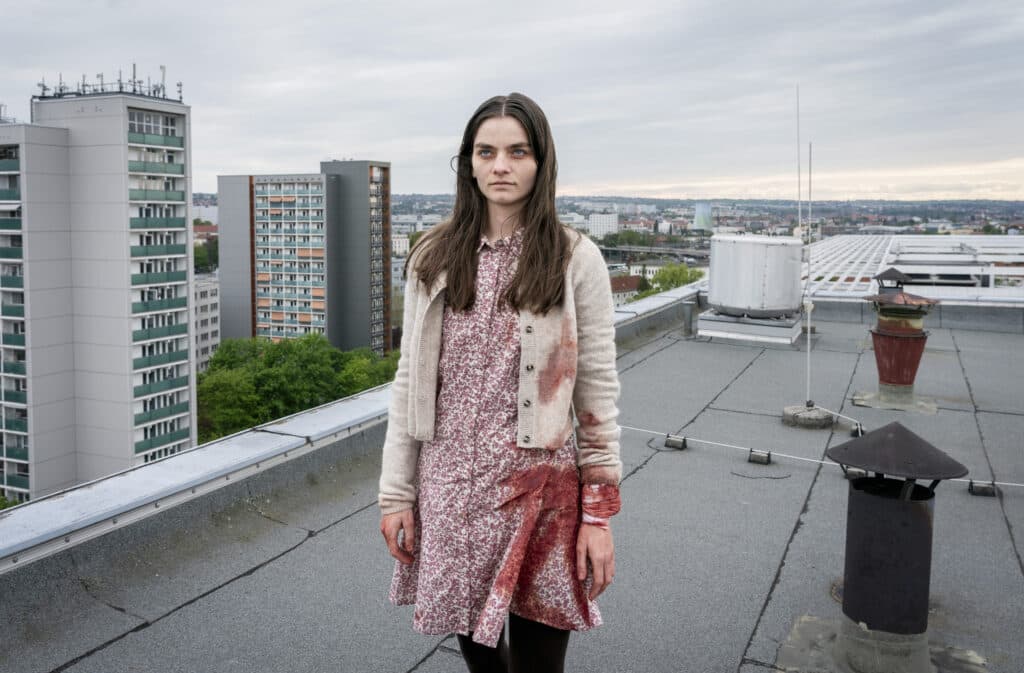 Amanda (Emilie Neumeister) auf einem Hausdach, sie sucht ihre Schwester Jana.