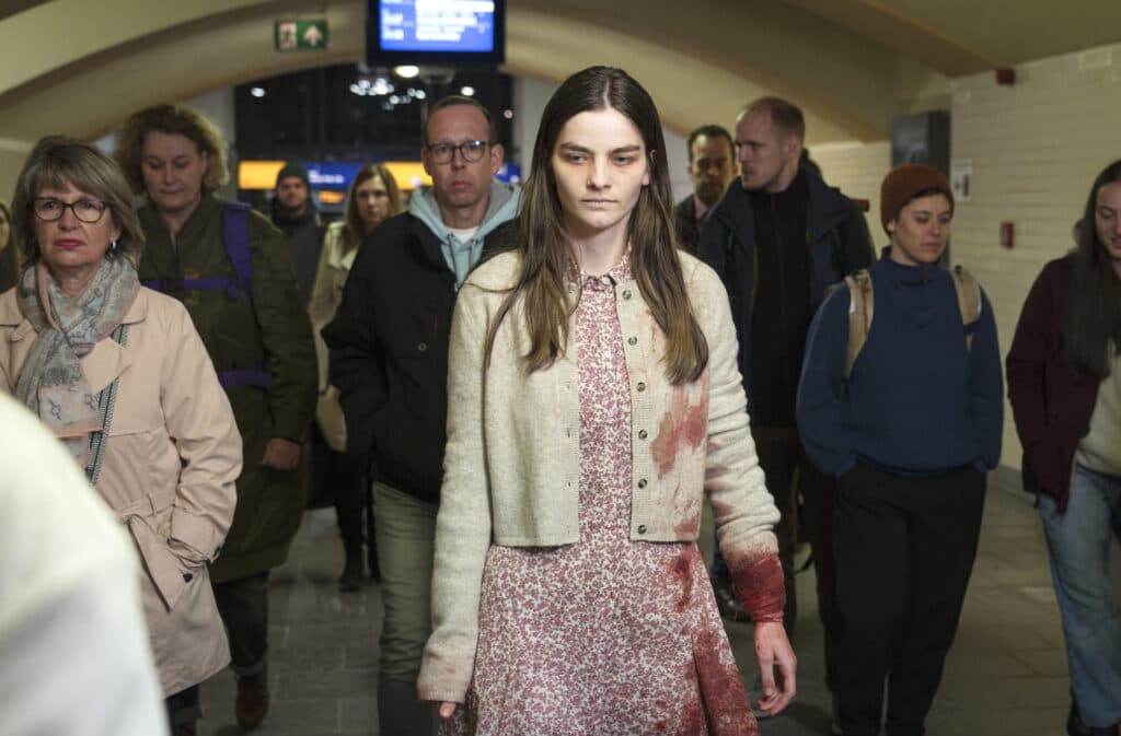 (v.l.n.r.): Amanda (Emilie Neumeister) blutverschmiert am Bahnhof.