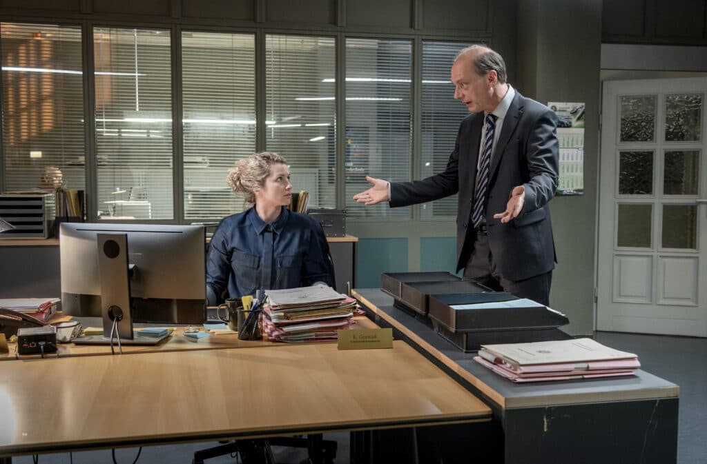 ARD/MDR TATORT: NACHTSCHATTEN, am Donnerstag (01.01.26) um 20:15 Uhr im ERSTEN. (v.l.n.r.): Leonie Winkler (Cornelia Gröschel) im Gespräch mit Peter Schnabel (Martin Brambach) im Kommissariat. © MDR/MadeFor/Steffen Junghans, honorarfrei - Verwendung gemäß der AGB im engen inhaltlichen, redaktionellen Zusammenhang mit genannter MDR-Sendung bei Nennung "Bild: MDR/MadeFor/Steffen Junghans" (S2+). MDR/HA Kommunikation, 04360 Leipzig, Tel: (0341) 300 6477 oder - 6463