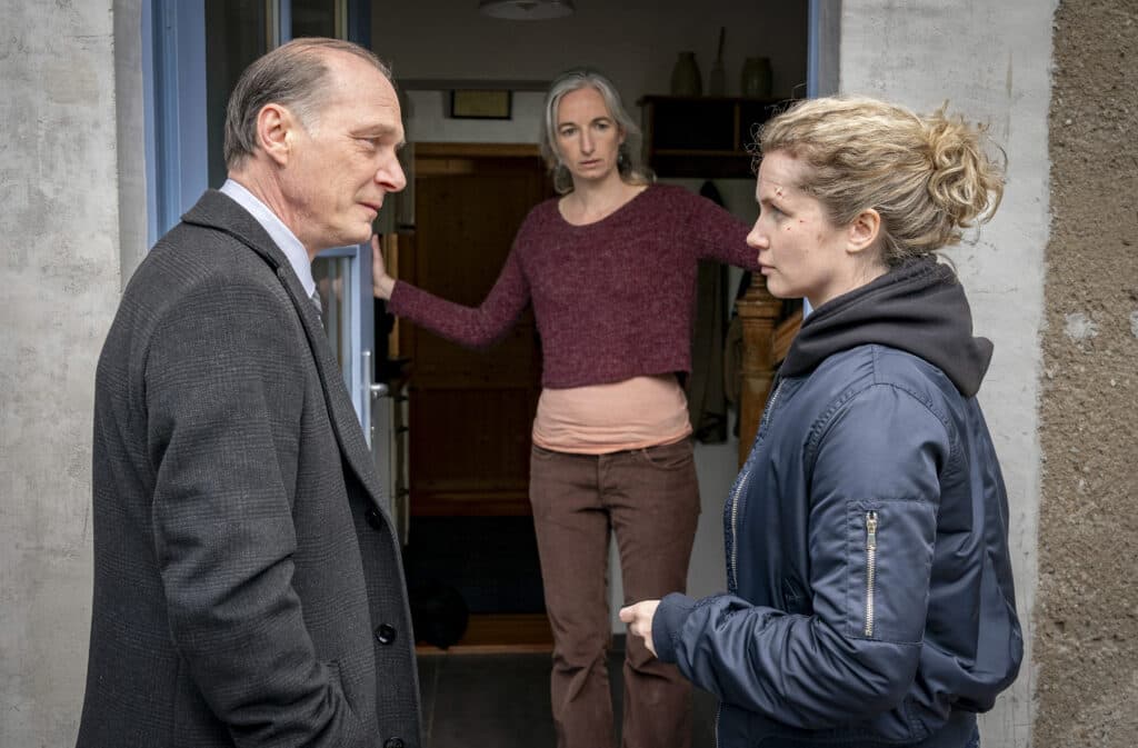 ARD/MDR TATORT: NACHTSCHATTEN, am Donnerstag (01.01.26) um 20:15 Uhr im ERSTEN. Peter Schnabel (Martin Brambach, li.) und Leonie Winkler (Cornelia Gröschel) ermitteln, ihr Weg führ sie zur Adresse eines Verdächtigen; Mareike Klann (Mélanie Fouché) öffnet. © MDR/MadeFor/Steffen Junghans, honorarfrei - Verwendung gemäß der AGB im engen inhaltlichen, redaktionellen Zusammenhang mit genannter MDR-Sendung bei Nennung "Bild: MDR/MadeFor/Steffen Junghans" (S2+). MDR/HA Kommunikation, 04360 Leipzig, Tel: (0341) 300 6477 oder - 6463