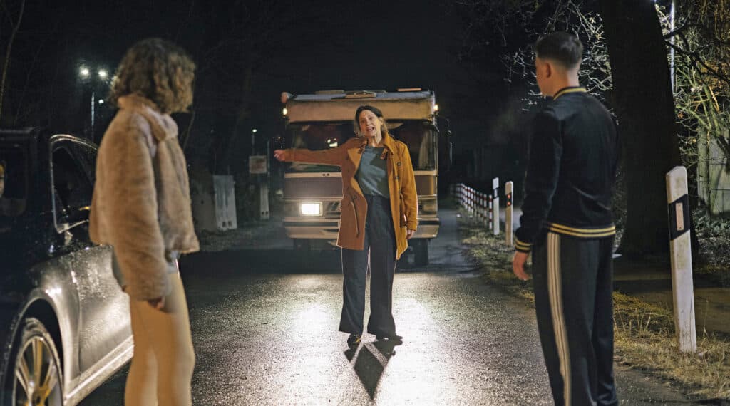 Gabriele Höpken (Mitte, Catrin Striebeck) überrascht ihre Tochter Betty (links, Mathilda Smidt) und Mike Hanisch (rechts, Niklas Marian Müller) vor dem Club.