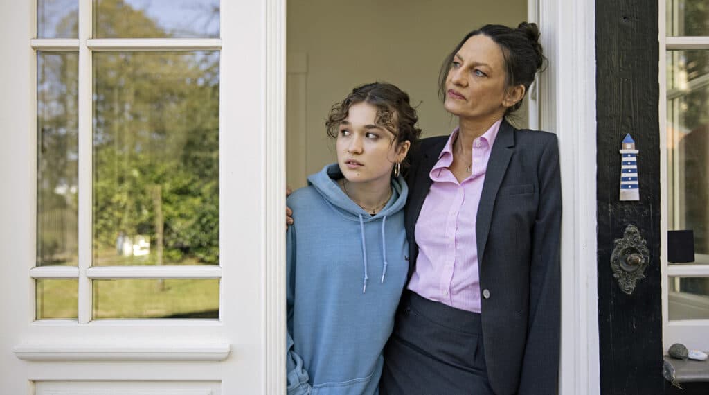 Betty Höpken (links, Mathilda Smidt) und ihre Mutter Gabriele Höpken (rechts, Catrin Striebeck) bekommen Besuch von der Polizei.