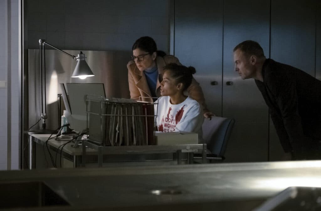 Gerichtsmedizinerin Jamila Marquez (Cynthia Micas, mitte) weist Staatsanwältin Sara Taghavi (Jasmin Tabatabai, li.) und Kommissar Robert Karow (Mark Waschke, re.) auf die Frakturen am Kopf des Toten hin.