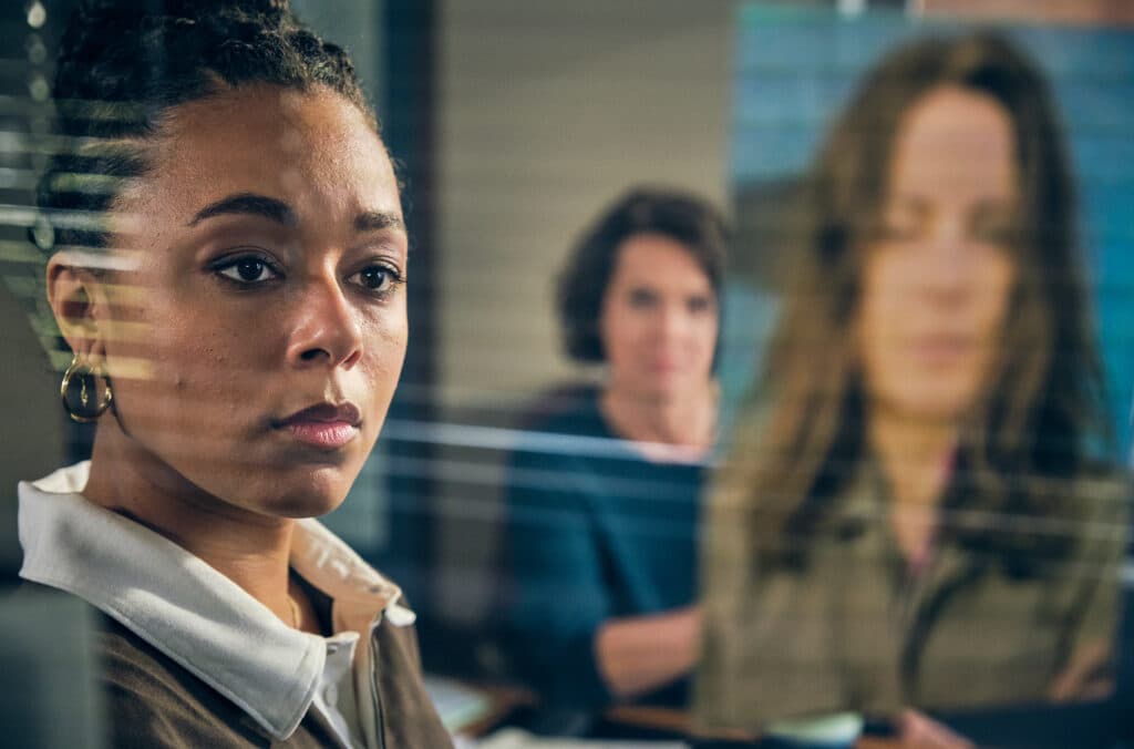 ARD/SWR TATORT: SASHIMI SPEZIAL, Fernsehfilm Deutschland 2026, am Sonntag (01.03.26) um 20:15 Uhr im ERSTEN. Mara Hermann (Davina Chanel Fox) mit Lena Odenthal (Ulrike Folkerts) beim Brainstorming im Präsidium © SWR/Benoît Linder, honorarfrei - Verwendung gemäß der AGB im engen inhaltlichen, redaktionellen Zusammenhang mit genannter SWR-Sendung und bei Nennung "Bild: SWR/Benoît Linder" (S2+). SWR Presse/Bildkommunikation, Baden-Baden, Tel: 07221/929-22202, foto@swr.de