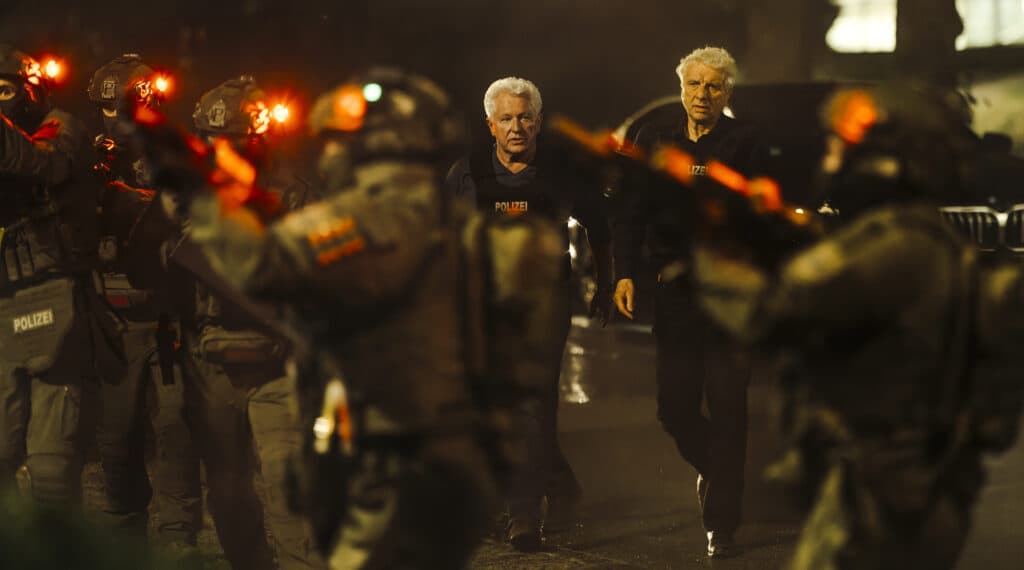 Von links: Kriminalhauptkommissar Ivo Batic (Miroslav Nemec) und Kriminalhauptkommissar Franz Leitmayr (Udo Wachtveitl) vor ihrem Einsatz mit den SEK Beamten am Karahaus.