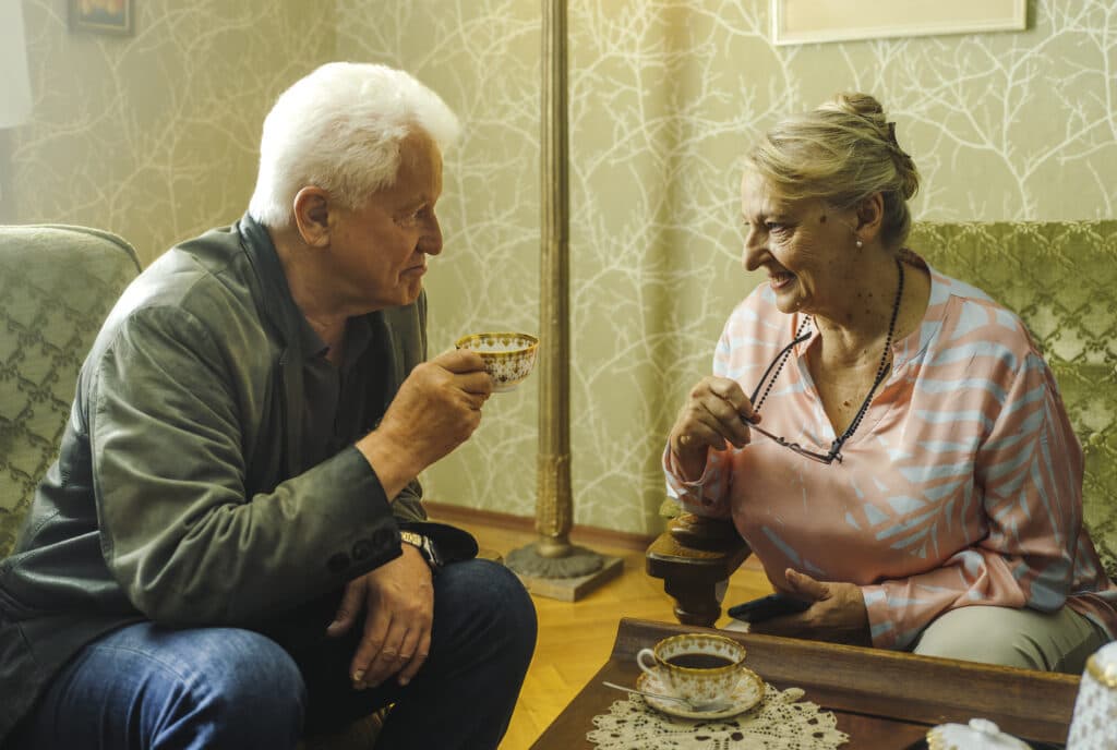 Von links: Kriminalhauptkommissar Ivo Batic (Miroslav Nemec) und Frau Breitlinger (Johanna Bittenbinder). Frau Breitlinger berichtet Batic bei einer Tasse Tee vom Streit in der Januar Nacht.