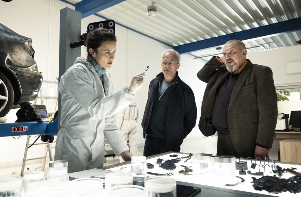ARD/WDR TATORT: SHOWTIME, Regie: Isabell Šuba, Buch: Arne Nolting & Jan Martin Scharf, am Sonntag (12.04.26) um 20:15 Uhr im ERSTEN. Max Ballauf (Klaus J. Behrendt) und Freddy Schenk (Dietmar Bär) in der KTU. Die KTU-Leiterin Natalie Förster (Tinka Fürst, l) hat den ausgebrannten Wagen und die Leiche untersucht. Sie berichtet den Kommissaren ihre Erkenntnisse. © WDR/BAVARIA FICTION/Martin Valentin Menke, honorarfrei - Verwendung gemäß der AGB im engen inhaltlichen, redaktionellen Zusammenhang mit genannter WDR-Sendung bei Nennung "Bild: WDR/BAVARIA FICTION/Martin Valentin Menke" (S2+). WDR Kommunikation/Redaktion Bild, Köln, Tel: 0221/220 -7132 oder -7133, Fax: -777132, bildkommunikation@wdr.de