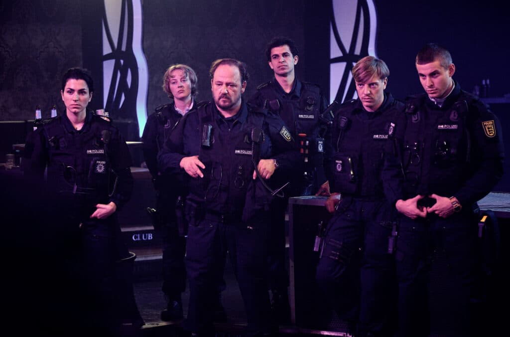 ARD/SWR TATORT: INNERE ANGELEGENHEITEN, am Sonntag (19.04.26) um 20:15 Uhr im ERSTEN. Die sechs Bereitschaftspolizisten, die als erste am Tatort waren, fühlen sich in die Ecke gedrängt. (V.l.n.r.: Anna Bardavelidze als Mariam, Caroline Hellwig als Pia, Andreas Anke als Wolle, Mouataz Alshaltouh als Mahmoud, Lasse Lehmann als Jakub und Ben Felipe als Timo. ©SWR/Benoît Linder, honorarfrei - Verwendung gemäß der AGB im engen inhaltlichen, redaktionellen Zusammenhang mit genannter SWR-Sendung und bei Nennung "Bild: SWR/Benoît Linder (S2+). SWR Presse/Bildkommunikation, Baden-Baden, Tel: 07221/929-22202, foto@swr.de
