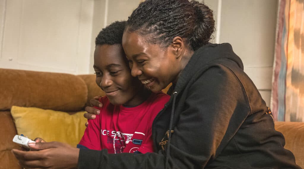 Betrachten die Fotos, die Yaro gemacht hat: Moya Alemu (Nambitha Ben-Mazwi, r.) und Yaro Alemu (André Nkot Olinga, r.).