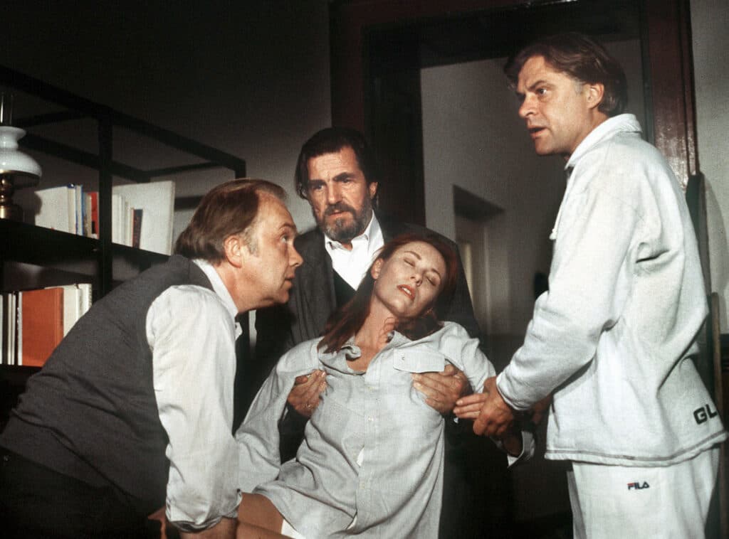 Kommissar Flemming (Martin Lüttge,l) hat Alice Rains (Andrea Sawatzki), die aus einer Privatklinik geflüchtet ist, in seine Obhut genommen. Ihr Mann (Claus Eberth, 2.v.r.), besteht jedoch darauf, dass Alice in die Klinik von Dr. Dernheim (Rüdiger Joswig) zurückgebracht wird.