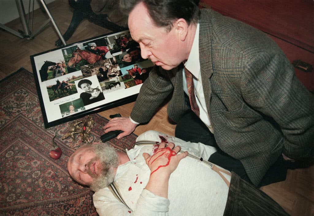 Hauptkommissar Ehrlicher (Peter Sodann, re) beugt sich über den ermordeten Karsunke (Rolf Hoppe)